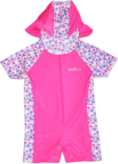 The hat is attached with clips to the nape of the neck, to keep the neck protected from the sun and to keep the hat on their head while in the pool or ocean. If you need to take the hat off, simply unclip the clips and it comes free. In addition to this, difficult beach nappy changes will be a thing of the past with the clips in our Rashoodz swimsuits crotch.
