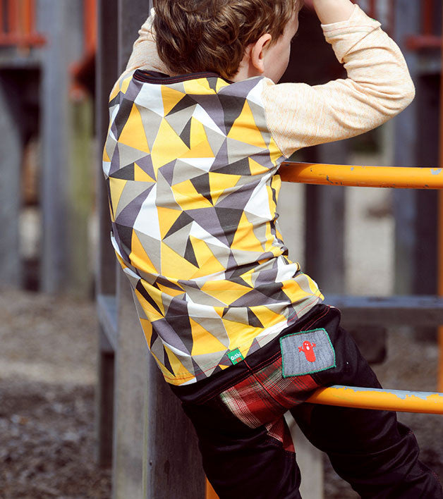 Super trendy yellow, black and grey geometric digital print body with orange cotton long sleeves.