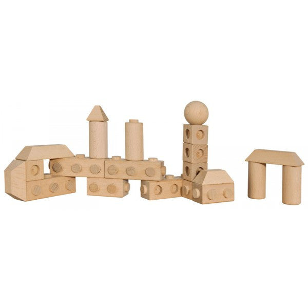 Babyarchitect consists of 22 wooden blocks in various shapes. There are no pins or other smaller parts - totally safe for toddlers. The size and shapes are specially designed for small hands and to encourage conscious engagement with play.