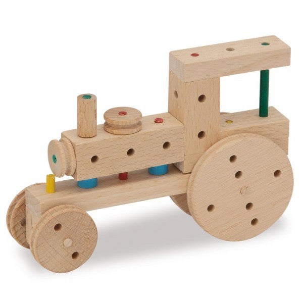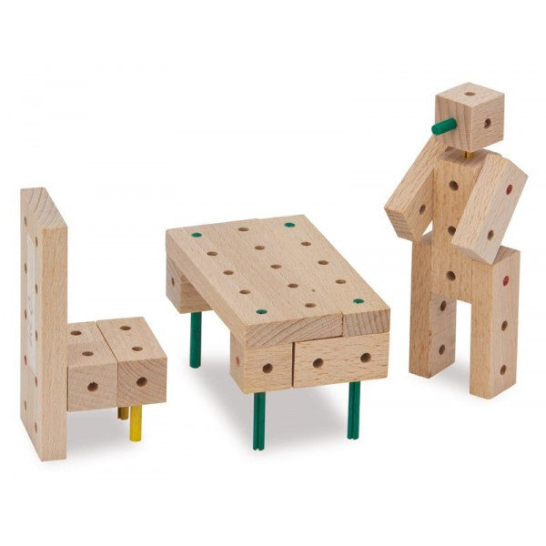 Matador is a construction set with wooden blocks that can be connected via pins. The idea was generated over 100 years ago when a father watched his children getting frustrated while playing with wooden blocks; any complex structure they tried to build simply collapsed. Being an engineer, he designed a toy wooden construction set made of blocks that could be connected with wooden pins. The idea took off and has delighted many generations of children. The possibilities are almost limitless and while each set comes with its own building instructions, Matador will also encourage your child to put together their own ideas.