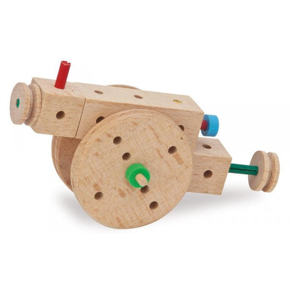 Each set has its own assortment of tools: a wooden hammer for assembling the parts and pliers and a wedge to take them apart again. Once the child has constructed her model, she will want to play with it for a while and show it to her friends. At any time she can take her model apart and build another one.