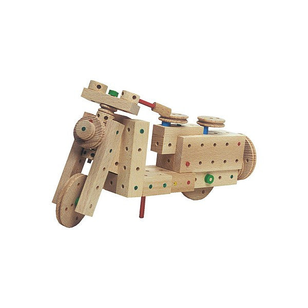Matador is a construction set with wooden blocks that can be connected via pins. The idea was generated over 100 years ago when a father watched his children getting frustrated while playing with wooden blocks; any complex structure they tried to build simply collapsed. Being an engineer, he designed a toy wooden construction set made of blocks that could be connected with wooden pins. The idea took off and has delighted many generations of children. The possibilities are almost limitless and while each set comes with its own building instructions, Matador will also encourage your child to put together their own ideas.