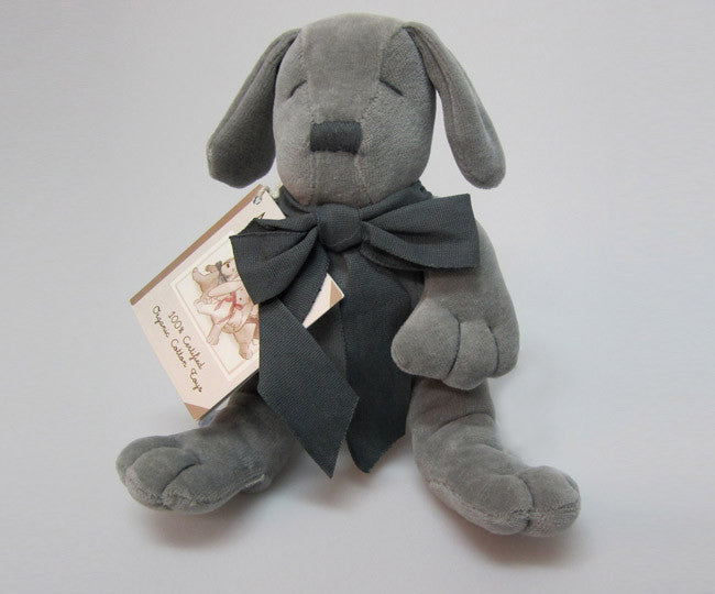 “Paws” the puppy dog has a hand stitched face and paws and a little curly tail. His ears are floppy and his favourite thing is to be hugged and to play hide & seek under the covers.