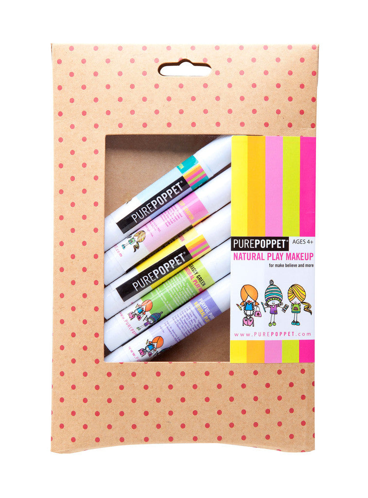 A pack of all five of the Pure Poppet play makeup crayons that are ideal for little fingers to easily colour in or draw simple patterns on the body. As they are a wax based product, they offer pastel shades that complement our bright mineral powders. Made with moisturising ingredients including Vitamin E and coloured with vegetable dyes, these are gentle on precious skin. Packaged in an easy to use wind up stick. Great as a base underneath the mineral powders to create different effects when dressing up or to create rainbow colours on cheeks and lips