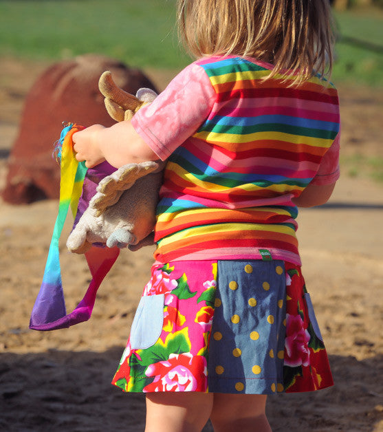 Fun and bright, light denim chambray skirt panels with mustard polka dots, and gorgeous hot pink, tropical floral print panels.