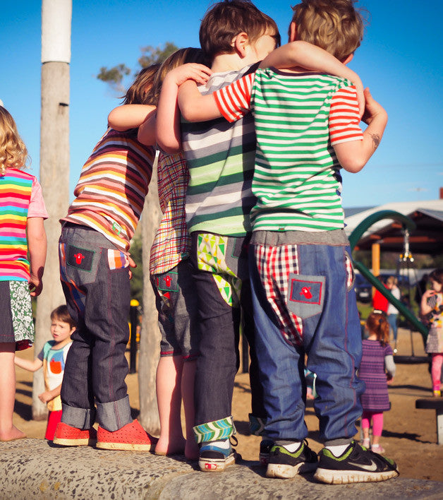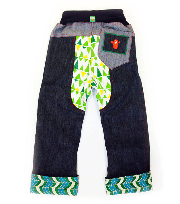 Please note the feature bottom panel will become distressed and build character with wash and wear. Rather than harsh treatments to achieve this look, we're getting the munchkins to do it organically.