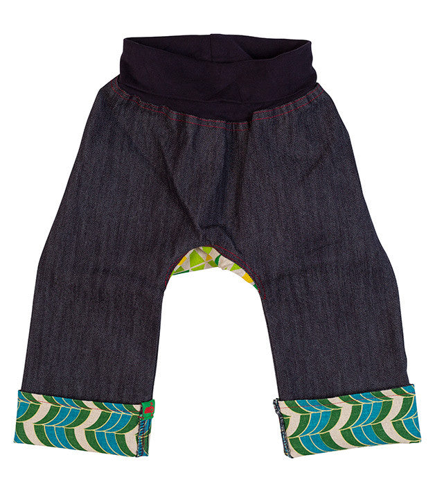 Ink denim chubba's, with citrus inspired triangles in lime and yellow, on a cool white linen base with cool ocean colour wavey pattern turn up cuffs.