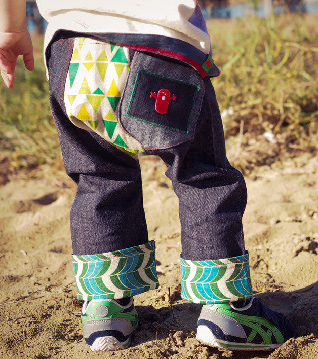 Please note the feature bottom panel will become distressed and build character with wash and wear. Rather than harsh treatments to achieve this look, we're getting the munchkins to do it organically.