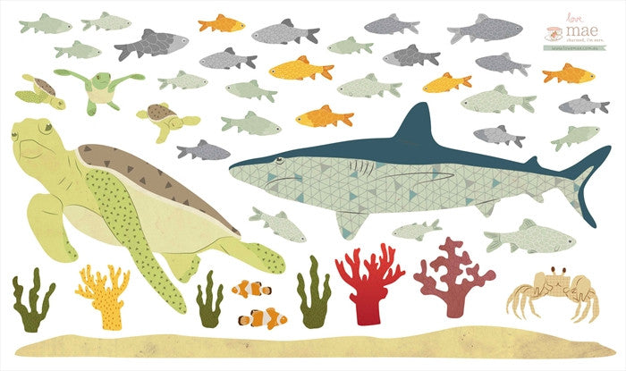 If its salt water you love, but you just can't see underwater that cleary. Well its time to put up Fishy tales in your room. A seriously mean shark who has somehow befriended a turtle and as long as those babies stick close to Dad they should have no problem. Get your nautical on with Love Mae fishy tales. Co-ordinates perfectly with Under the Sea Nautical and Pirate Ship. Please see sheet layout for exactly what you will receive. Sizing: Turtle 19 x 13cm (3.5 x 5.1?), Shark 26 x 9cm (10.2 x 3.5?), Fish approx 5 x 2cm (2 x.7?). Love Mae's delightful FABRIC wall stickers are lovingly designed with the finer details in mind. Our gorgeous decals can be applied to any smooth surface, if you change your mind you can whip the decals off neatly and move them around as much as you like. Perfect for rental homes needing a little something special or for the creative types who love to rearrange their space. We hope you enjoy using Love Mae's range of products to decorate your special space.