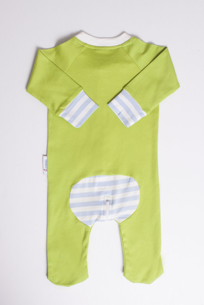 Funky grow suit for baby boys or girls in lime green with sky blue and white striped cuffs and bum patch. Features: Full zip opening from chin to bum for quick and easy dressing Round neck with zip cover to protect baby's chin Soft inner facing to protect their delicate skin from the zip Built-in feet are extra long to accomodate for growth Soft cotton-elastane stretch fabric for a comfortable fit