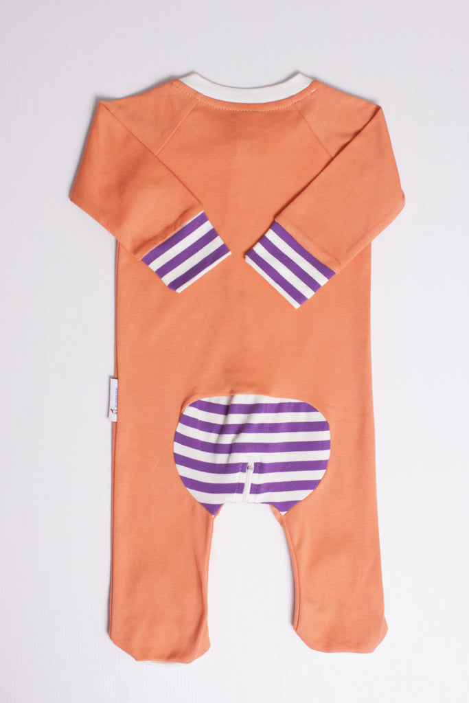 Funky grow suit for baby boys or girls in bright orange with purple and white striped cuffs and bum patch. Features: Full zip opening from chin to bum for quick and easy dressing Round neck with zip cover to protect baby's chin Soft inner facing to protect their delicate skin from the zip Built-in feet are extra long to accomodate for growth Soft cotton-elastane stretch fabric for a comfortable fit